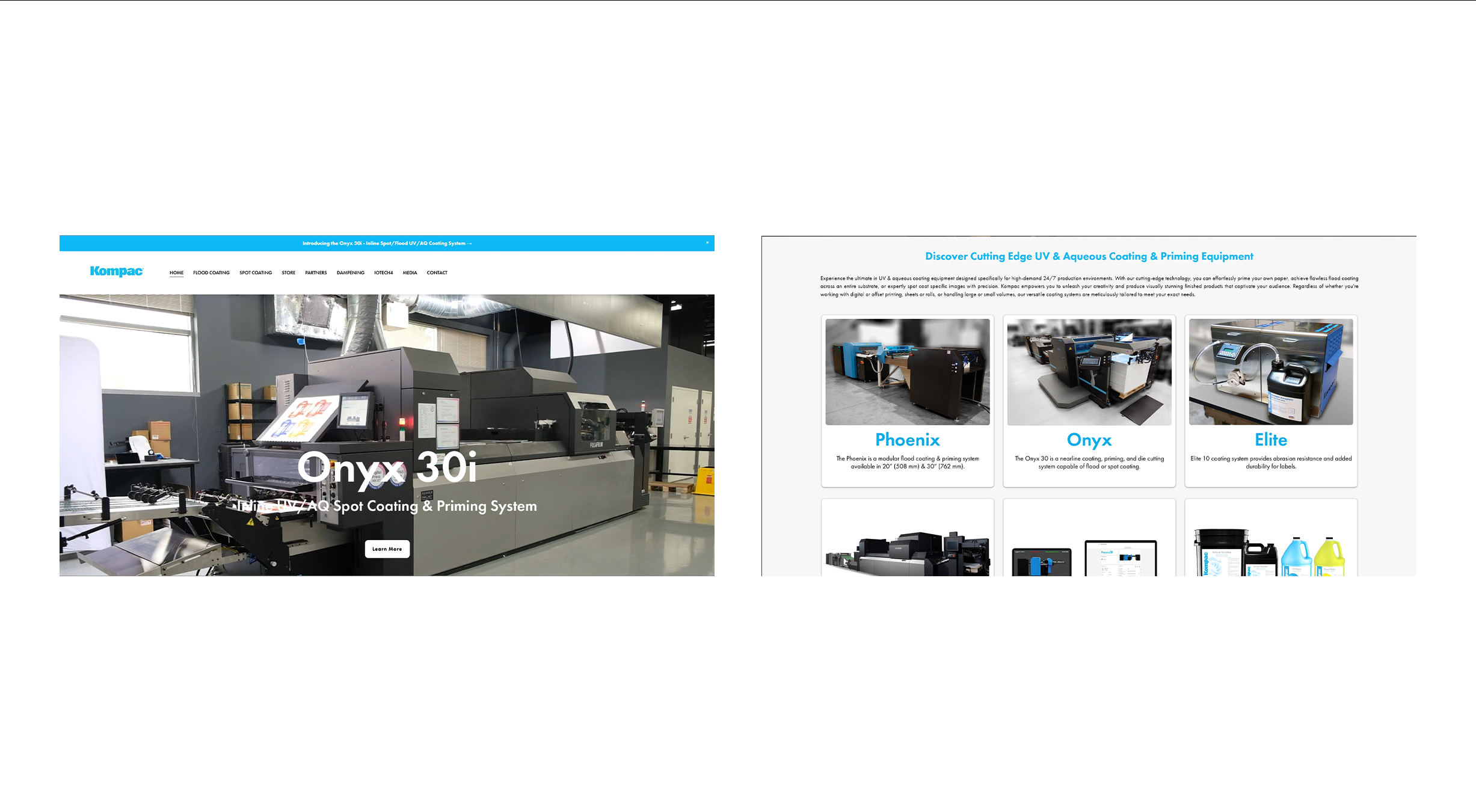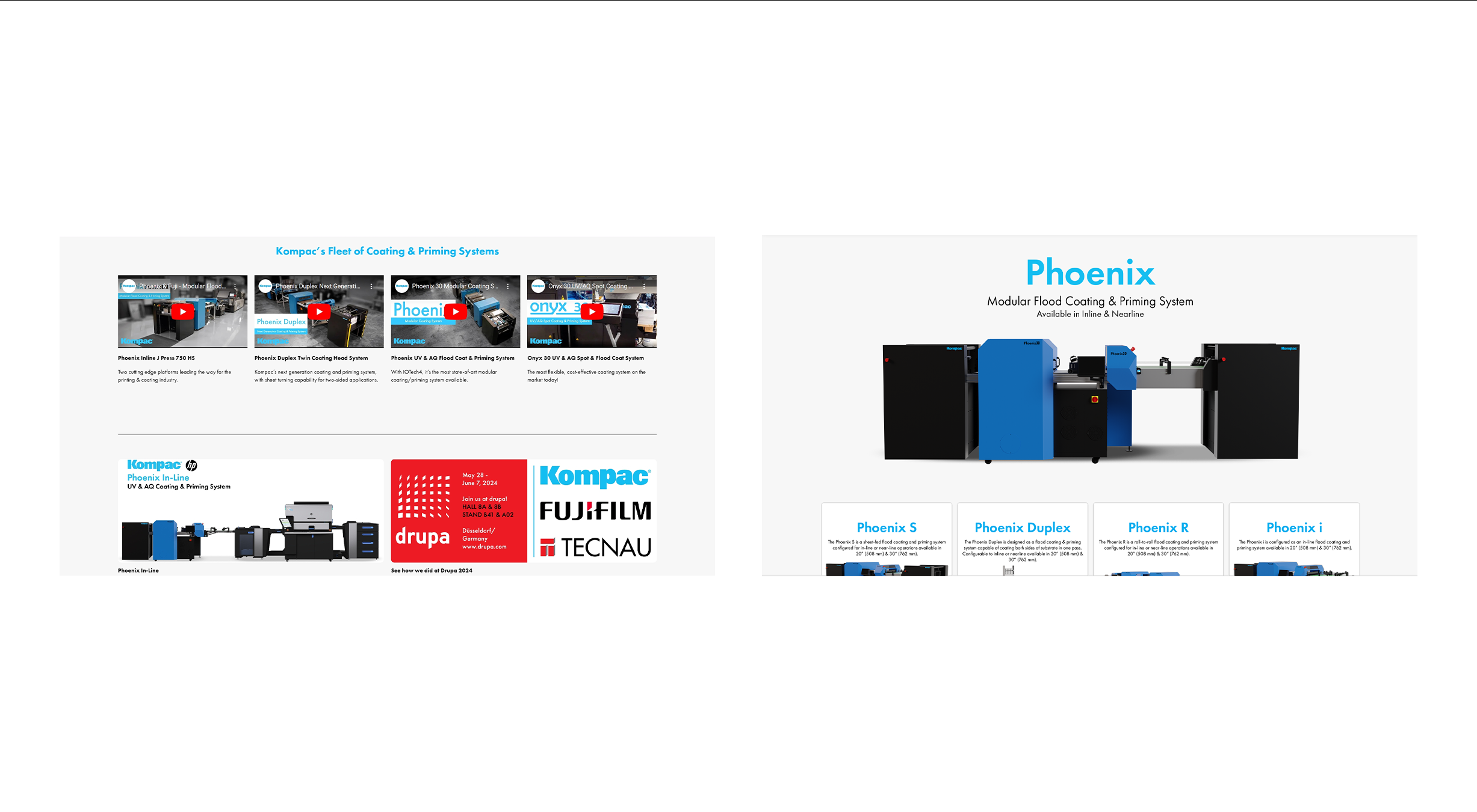 Carousel Ads: Different Kompac products (flood coating, spot coating, and priming systems) were highlighted with images of the equipment in action.